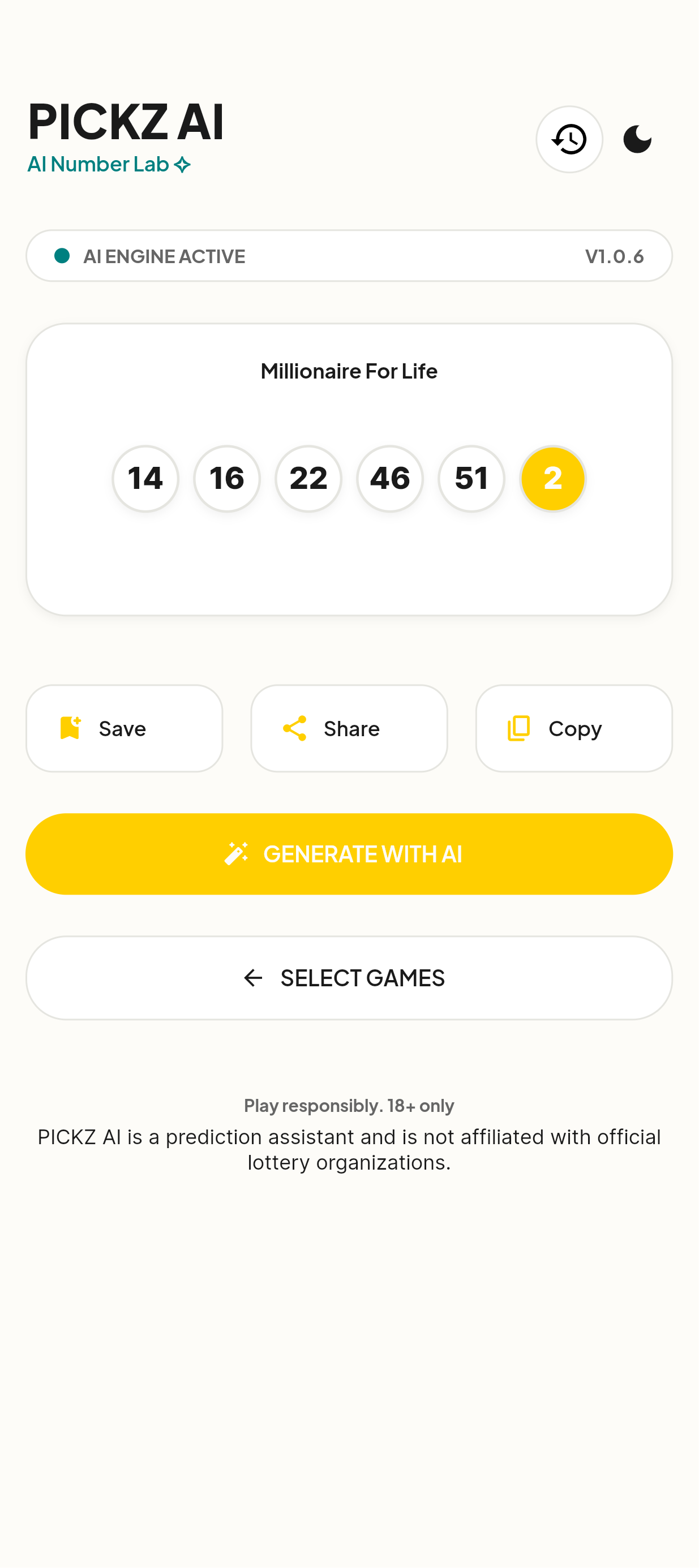 PICKZ AI provides AI-generated number picks for Millionaire For Life, helping users generate combinations in seconds.The app focuses on speed, simplicity, and structured number generation, allowing players to quickly access new picks anytime they want.