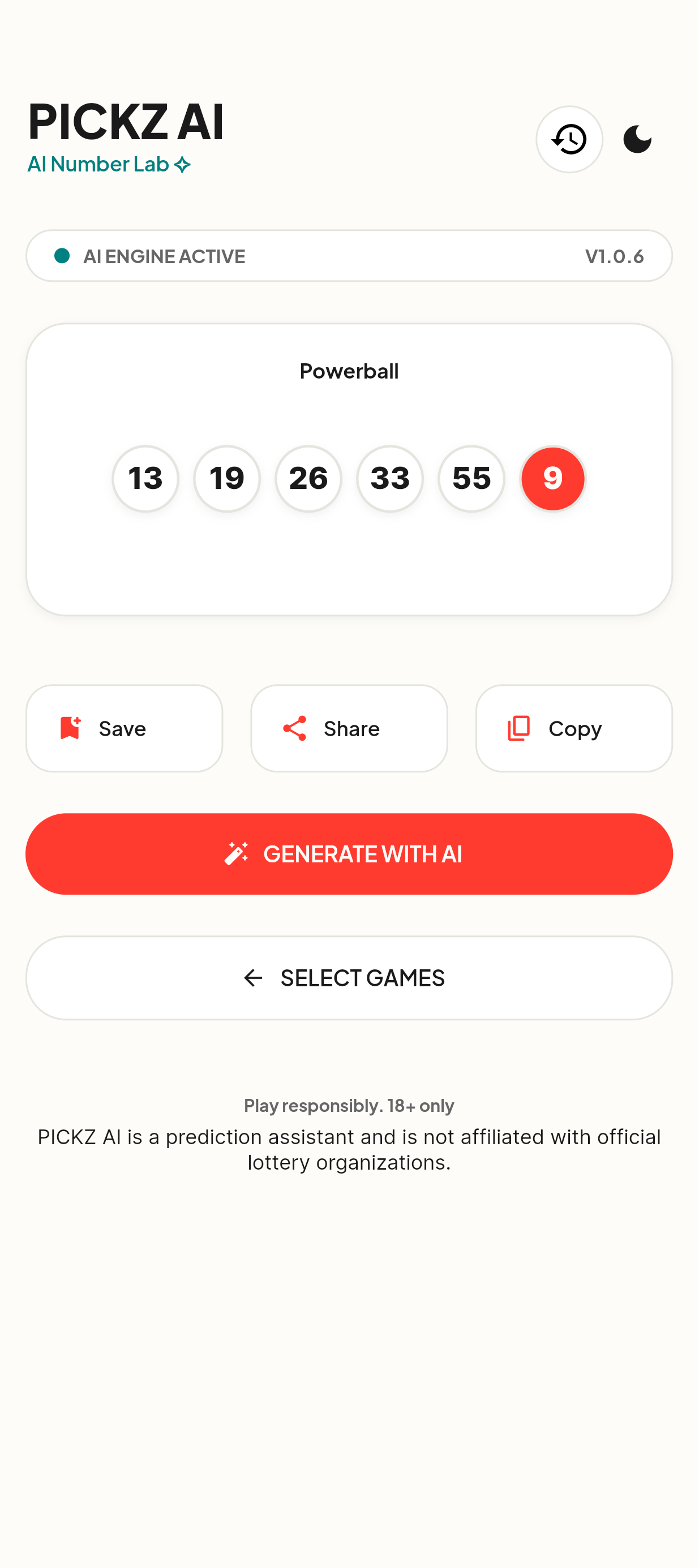 Balanced combinations powered by AI logic💾 Save & track your lucky numbers