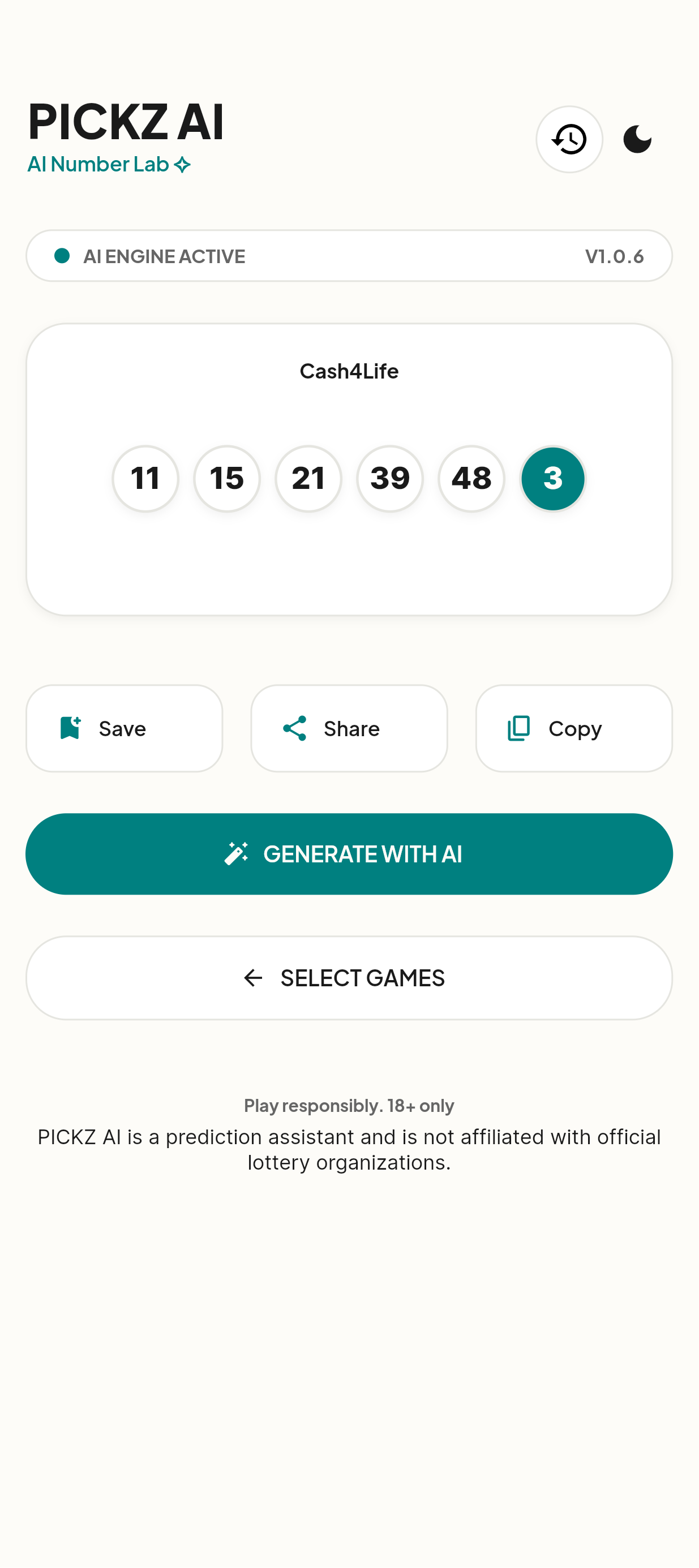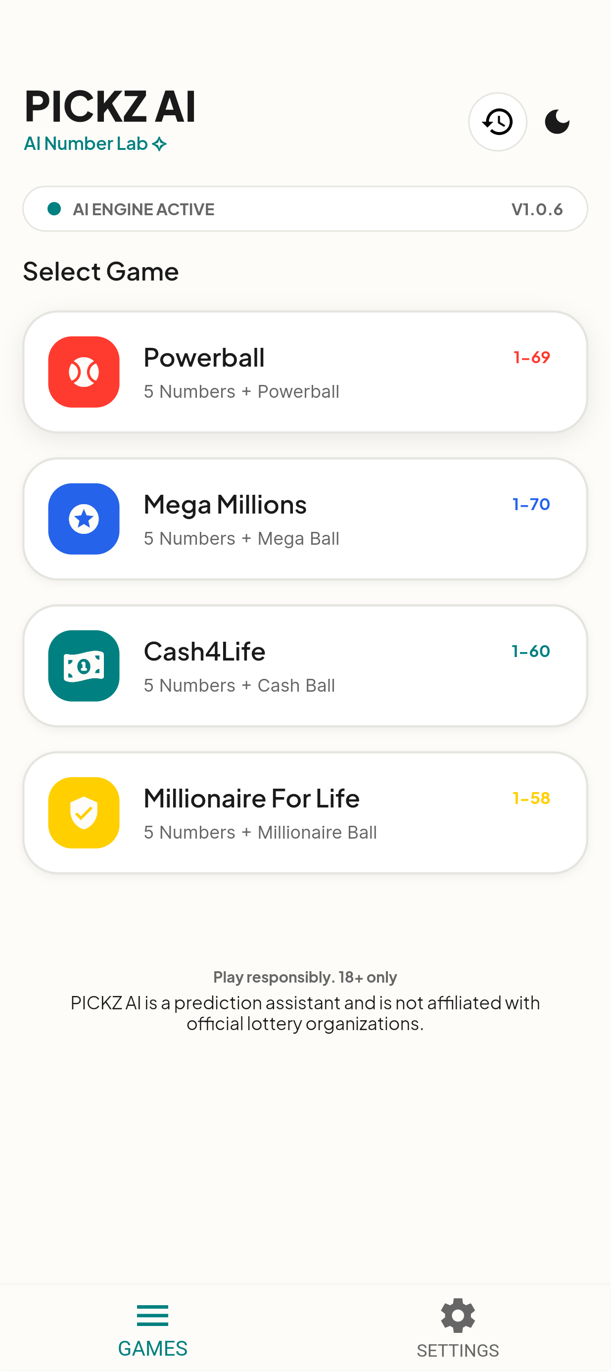PICKZ AI helps users generate Cash4Life number combinations instantly using intelligent number generation.The app produces quick and balanced picks for daily-style lottery games, making it easier for users to stay consistent without manually choosing numbers each time.