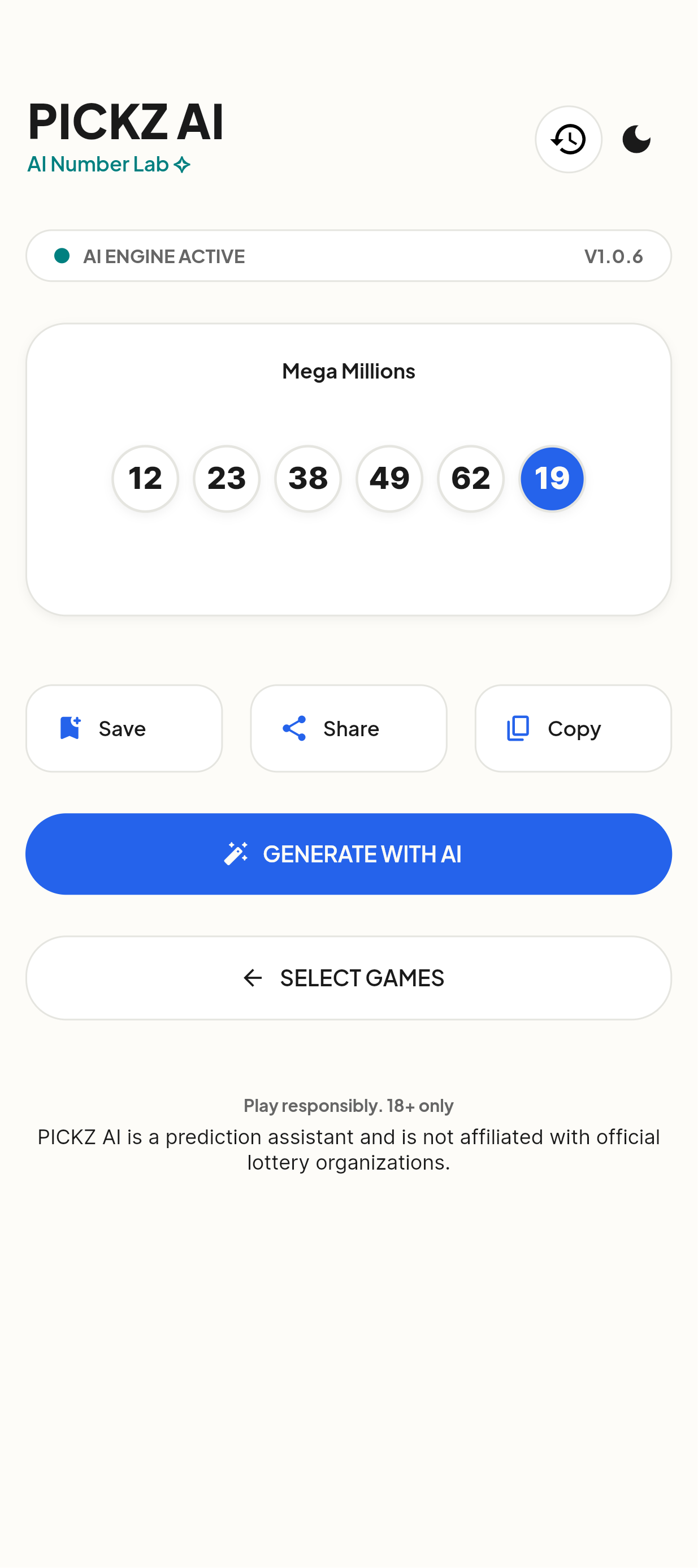 PICKZ AI allows users to generate Mega Millions number combinations using advanced AI-powered selection logic.The app creates fast, randomized yet structured picks, helping players avoid repetitive or unbalanced number choices. The experience is simple, fast, and built for everyday lottery players.